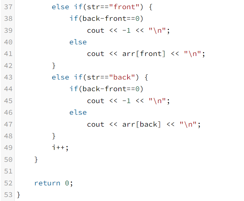 - back: 큐의 가장 뒤에 있는 정수를 출력한다. 만약 큐에 들어있는 정수가 없는 경우에는 -1을 출력한다.