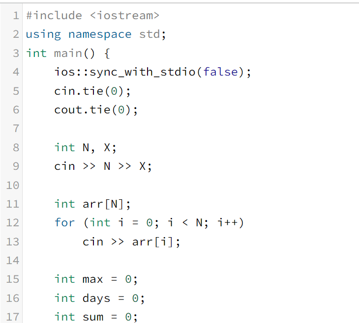 (이렇게 새로 계산한 sum 값이 max 값과 같다면 days를 하나 올려주고, sum이 max보다 크다면 max값을 다시 선언 하고 days값도 1로 다시 초기화한다.)