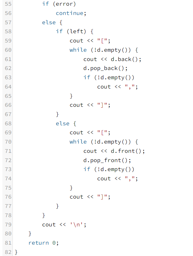 R 또는 D에 따라 덱을 뒤집거나, 제일 앞에 있는 숫자를 빼준다.