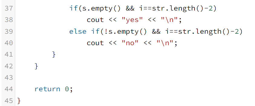 for문이 str[str.length()-2]를 고려할 차례일 때 스택 s가 비었다면 "yes"를 출력하고, 스택 s가 비어있지 않다면 "no"를 출력한다.