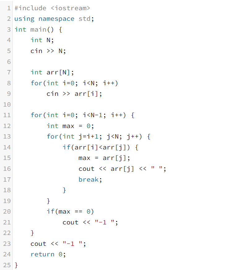 크기가 N인 수열 A = A1, A2, ..., AN이 있다. 수열의 각 원소 Ai에 대해서 오큰수 NGE(i)를 구하려고 한다. Ai의 오큰수는 오른쪽에 있으면서 Ai보다 큰 수 중에서 가장 왼쪽에 있는 수를 의미한다. 그러한 수가 없는 경우에 오큰수는 -1이다.