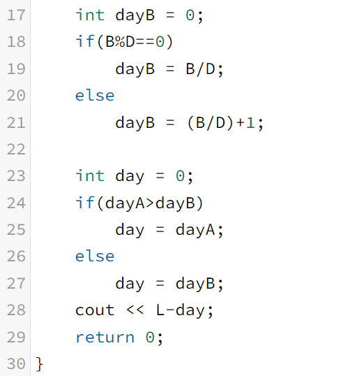 한 줄에 하나씩 총 다섯 줄에 걸쳐 L, A, B, C, D가 주어진다. (2 ≤ L ≤ 40, 1 ≤ A, B ≤ 1000, 1 ≤ C, D ≤ 100) 항상 방학 숙제를 방학 기간내에 다 할 수 있는 경우만 입력으로 주어진다.