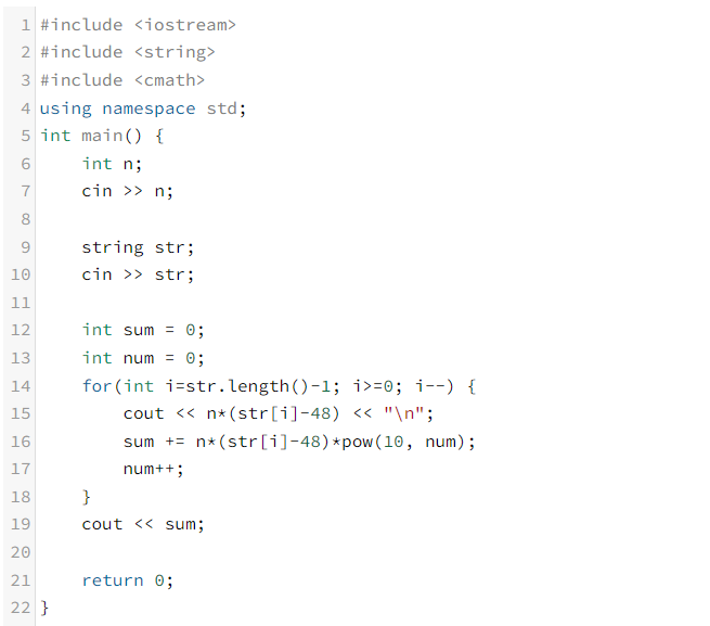 2. 두 번째 숫자는 하나씩 계산해야하므로 하나씩 계산하기 좋게 문자열로 입력받는다.