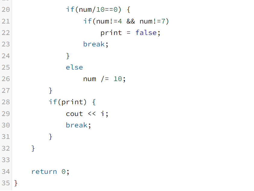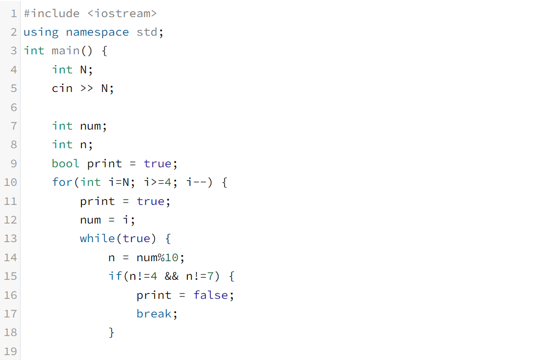 숫자 i에 4나 7이 들어있다면 해당 숫자 i를 출력한 후 종료한다.