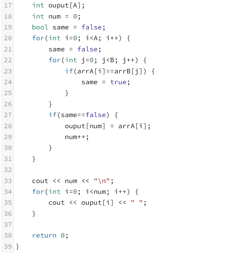 3. for문을 통해 반복하며 A에는 있지만 B에는 없는 원소들을 따로 배열해 저장해둔다.