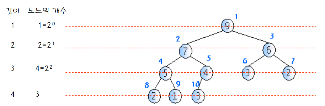 - 힙의 높이: n개의 노드를 가지고 있는 힙의 높이는 O(logn), 마지막 레벨을 제외하고 각 레벨 i 에 (2의 i제곱 - 1)개의 노드가 존재