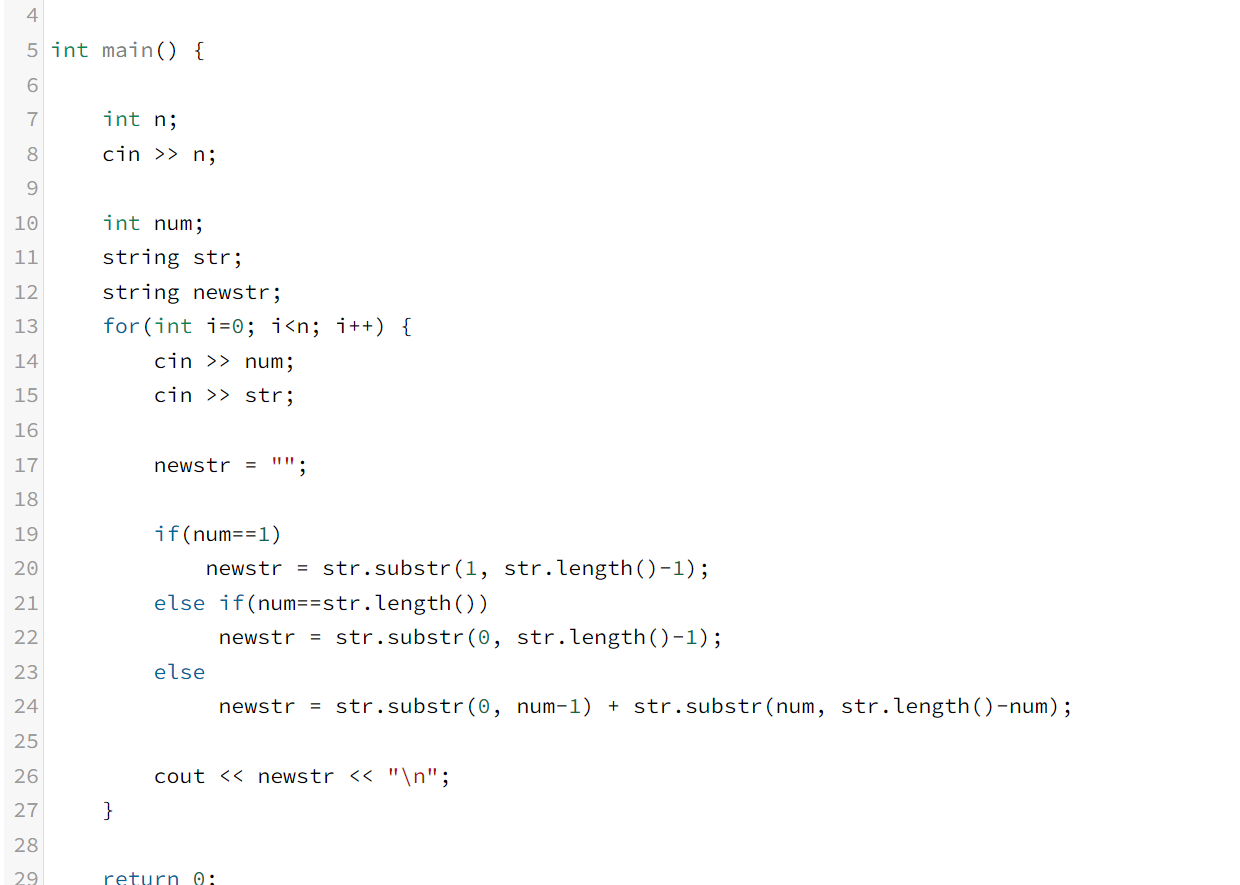 첫째 줄에 테스트 케이스의 개수 T(1<=T<=1,000)가 주어진다. 각 테스트 케이스는 한 줄로 구성되어 있다. 첫 숫자는 창영이가 오타를 낸 위치이고, 두 번째 문자열은 창영이가 친 문자열이다. 문자