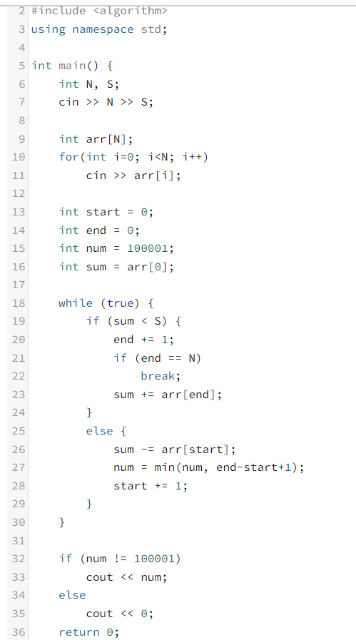 계산하면서 총 더한 sum의 값보다 주어진 S값이 크면 계속 반복문을 돌며 숫자를 더해나가고,