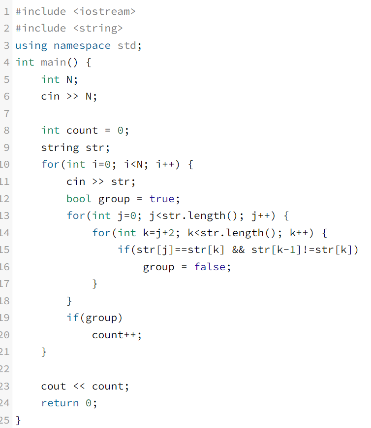 https://www.acmicpc.net/problem/1316 1316번: 그룹 단어 체커 그룹 단어란 단어에 존재하는 모든 문자에 대해서, 각 문자가 연속해서 나타나는 경우만을 말한다. 예를 들면, ccazzzzbb는 c, a, z, b가 모두 연속해서 나타나고, kin도 k, i, n이 연속해서 나타나기 때 www.acmicpc.net c++로 백준 1316번 문제를 풀어보겠다. 문제 그룹 단어란 단어에 존재하는 모든 문자에 대해서, 각 문자가 연속해서 나타나는 경우만을 말한다. 예를 들면, ccazzzzbb는 c, a, z, b가 모두 연속해서 나타나고, kin도 k, i, n이 연속해서 나타나기 때문에 그룹 단어이지만, aabbbccb는 b가 떨어져서 나타나기 때문에 그룹 단어가 아니다. 단어..