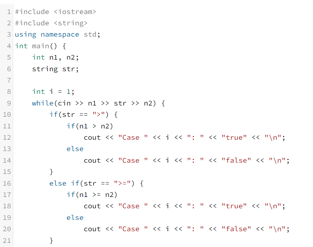 https://www.acmicpc.net/problem/5656 ", ">=", " 크다 >= 크거나 같다 = 3은 "true"를 리턴한다. C언어의 비교 연산식이 주어졌을 때, 결과를 구하는 프로그램을 작성하시오. 입력 입력은 최대 12000줄로 이루어져 있다. 각 줄은 두 정수 a, b가 주어지며, 정수 사이에는 연산자 ">", ">=", ""일때 조건에 따라 수행한다. 입력받은 str이 ">="일때 조건에 따라 수행한다. 입력받은 str이 "