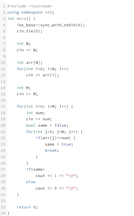 https://www.acmicpc.net/problem/1920 1920번: 수 찾기 첫째 줄에 자연수 N(1 ≤ N ≤ 100,000)이 주어진다. 다음 줄에는 N개의 정수 A[1], A[2], …, A[N]이 주어진다. 다음 줄에는 M(1 ≤ M ≤ 100,000)이 주어진다. 다음 줄에는 M개의 수들이 주어지는데, 이 수들 www.acmicpc.net c++로 백준 1920번 문제를 풀어보겠다. 문제 N개의 정수 A[1], A[2], …, A[N]이 주어져 있을 때, 이 안에 X라는 정수가 존재하는지 알아내는 프로그램을 작성하시오. 입력 첫째 줄에 자연수 N(1 ≤ N ≤ 100,000)이 주어진다. 다음 줄에는 N개의 정수 A[1], A[2], …, A[N]이 주어진다. 다음 줄에는 M(1 ≤ ..