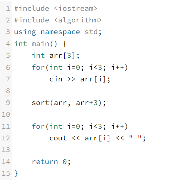 https://www.acmicpc.net/problem/2752 2752번: 세수정렬 숫자 세 개가 주어진다. 이 숫자는 1보다 크거나 같고, 1,000,000보다 작거나 같다. 이 숫자는 모두 다르다. www.acmicpc.net c++로 백준 2752번 문제를 풀어보겠다. 문제 동규는 세수를 하다가 정렬이 하고싶어졌다. 숫자 세 개를 생각한 뒤에, 이를 오름차순으로 정렬하고 싶어 졌다. 숫자 세 개가 주어졌을 때, 가장 작은 수, 그 다음 수, 가장 큰 수를 출력하는 프로그램을 작성하시오. 입력 숫자 세 개가 주어진다. 이 숫자는 1보다 크거나 같고, 1,000,000보다 작거나 같다. 이 숫자는 모두 다르다. 출력 제일 작은 수, 그 다음 수, 제일 큰 수를 차례대로 출력한다. 예제 입력 1 복사..