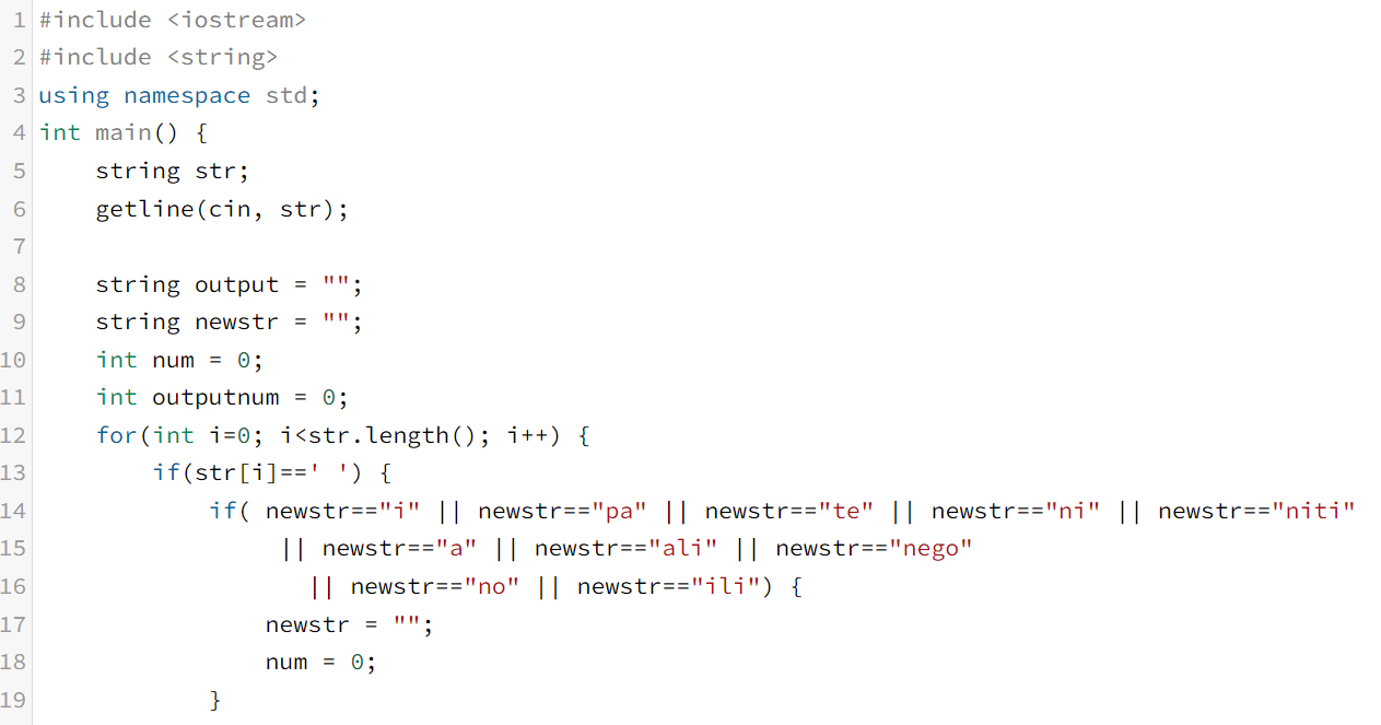 https://www.acmicpc.net/problem/3181 3181번: 줄임말 만들기 꿍은 만사가 귀찮아서 말을 하기도 귀찮아 한다. 그래서 하려는 말을 대신해줄 줄임말을 만들려고 하는데 나름 규칙을 만들었다. 하려는 말은 최소 하나 이상의 단어를 포함하는데 각 단어들은 www.acmicpc.net c++로 백준 3181번 문제를 풀어보겠다. 문제 꿍은 만사가 귀찮아서 말을 하기도 귀찮아 한다. 그래서 하려는 말을 대신해줄 줄임말을 만들려고 하는데 나름 규칙을 만들었다. 하려는 말은 최소 하나 이상의 단어를 포함하는데 각 단어들은 정확히 한칸의 공백으로 구분이 된다. 줄임말을 만들때는 각 단어의 앞글자를 따서 만들어지는데 다음의 단어들은 쓸모없는 단어들이므로 무시한다. 'i', 'pa', 'te'..